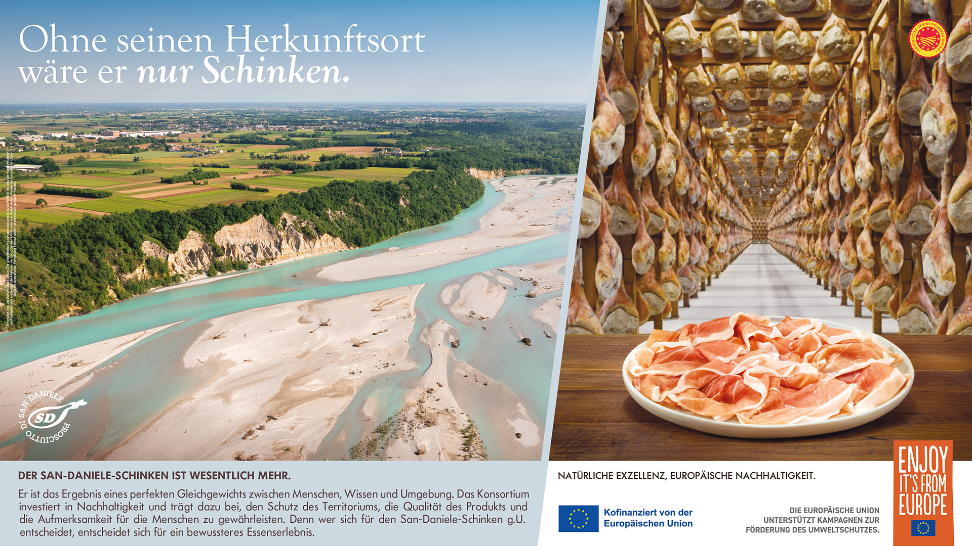 Nach dem erfolgreichen Abschluss der dreijährigen Kampagne „In Europa trifft der Respekt für Tradition auf den Respekt für die Umwelt“ hat das Konsortium für San-Daniele-Schinken ein neues dreijähriges Informations- und Förderprogramm gestartet, das von der Europäischen Union im Rahmen der Verordnung 1144/2014 mitfinanziert wird. Das Projekt mit einer Laufzeit von 36 Monaten und einem Gesamtwert von mehr als 3 Millionen Euro wurde dem Mailänder Unternehmen AB Comunicazioni anvertraut, das als ausführende Stelle das Konsortium bei der Entwicklung und Durchführung der in Italien, Frankreich und Deutschland geplanten Aktivitäten unterstützen wird, um die Präsenz des Produkts auf den europäischen Märkten durch eine kohärente und wertorientierte Darstellung zu stärken.